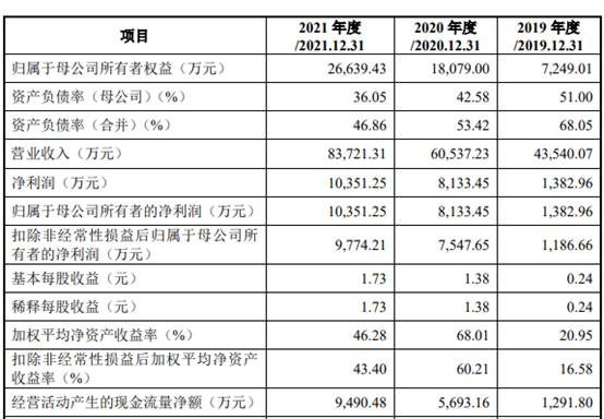 招股书显示,2018年至2021年,达科为实现营业收入分别为32,956.23万元、43,540.07万元、60,537.23万元、83,721.31万元,净利润(归属于母公司所有者的净利润)分别为1,127.04万元、1,382.96万元、8,133.45万元、10,351.25万元,扣除非经常性损益后归属于母公司所有者的净利润分别为1,024.25万元、1,186.66万元、7,547.65万元、9,774.21万元。