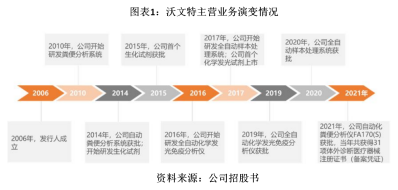 沃文特2006年成立之初,主要以体外诊断产品代理销售业务为主。自2010年开始,该公司开始自动化粪便分析仪等自动化诊断仪器、试剂和耗材产品的研发;2014年自动粪便分析系统获批,同年开始研发生化试剂;2015年首个生化试剂获批,次年开始研发全自动化学发光免疫分析仪;2017年开始研发全自动样本处理系统,同年首个化学发光试剂上市。