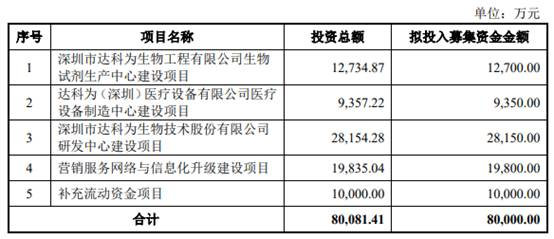 公司拟募集资金8亿元,拟分别用于深圳市达科为生物工程有限公司生物试剂生产中心建设项目、达科为(深圳)医疗设备有限公司医疗设备制造中心建设项目、深圳市达科为生物技术股份有限公司研发中心建设项目、营销服务网络与信息化升级建设项目、补充流动资金项目。