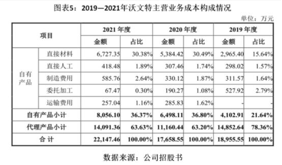 据招股书披露,2019—2021年,沃文特的主营业务成本分别为1.89亿元、1.76亿元、2.21亿元,其中,代理产品的营业成本占各期主营业务成本的比重分别为78.36%、63.2%、63.63%,占比一直维持在较高水平。