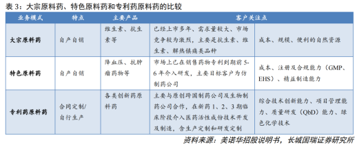 从业务模式来看,原料药主要分为大宗原料药、特色原料药和专利药原料药三大类,而且有着不同的市场特点: