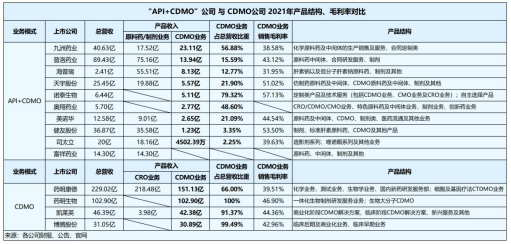 对比来看,九洲药业、普洛药业、海普瑞、天宇股份等从原料药转型到CDMO的“API+CDMO”公司,与博腾股份、凯莱英、药明生物等以CDMO业务为主的公司在CDMO业务的营收规模上差异较大。